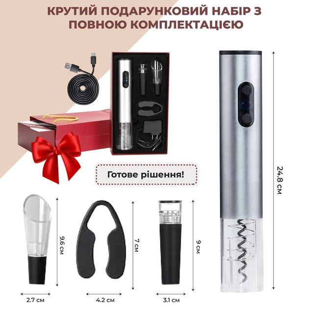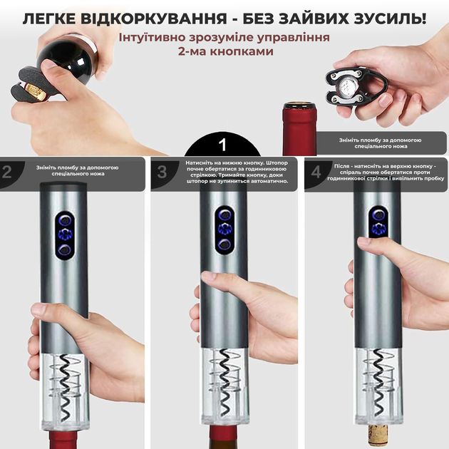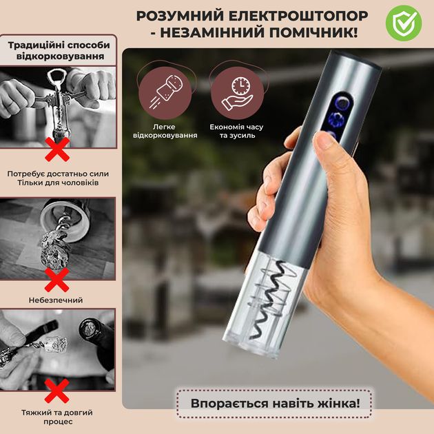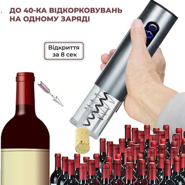 Акумуляторний електроштопор відмінний та виготовлений якісно. Це найкраще рішення, так як ми полюбляємо приймати гостей і тепер відкорковувати вино стало зручно і елегантно. Рекомендую.