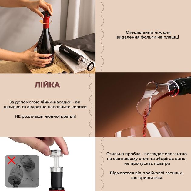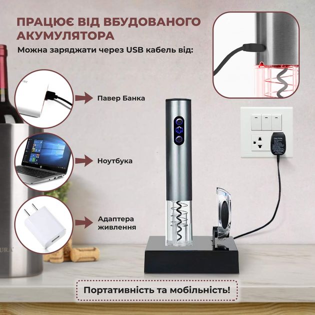 Електричний штопор є гарною прикрасою обіднього столу, підходить для сімейних свят, відпочинку з друзями, походів, кемпінгу, барбекю , подорожей та ін. Якщо вам подобається вино, не відмовляйтеся від таких корисних інструментів.